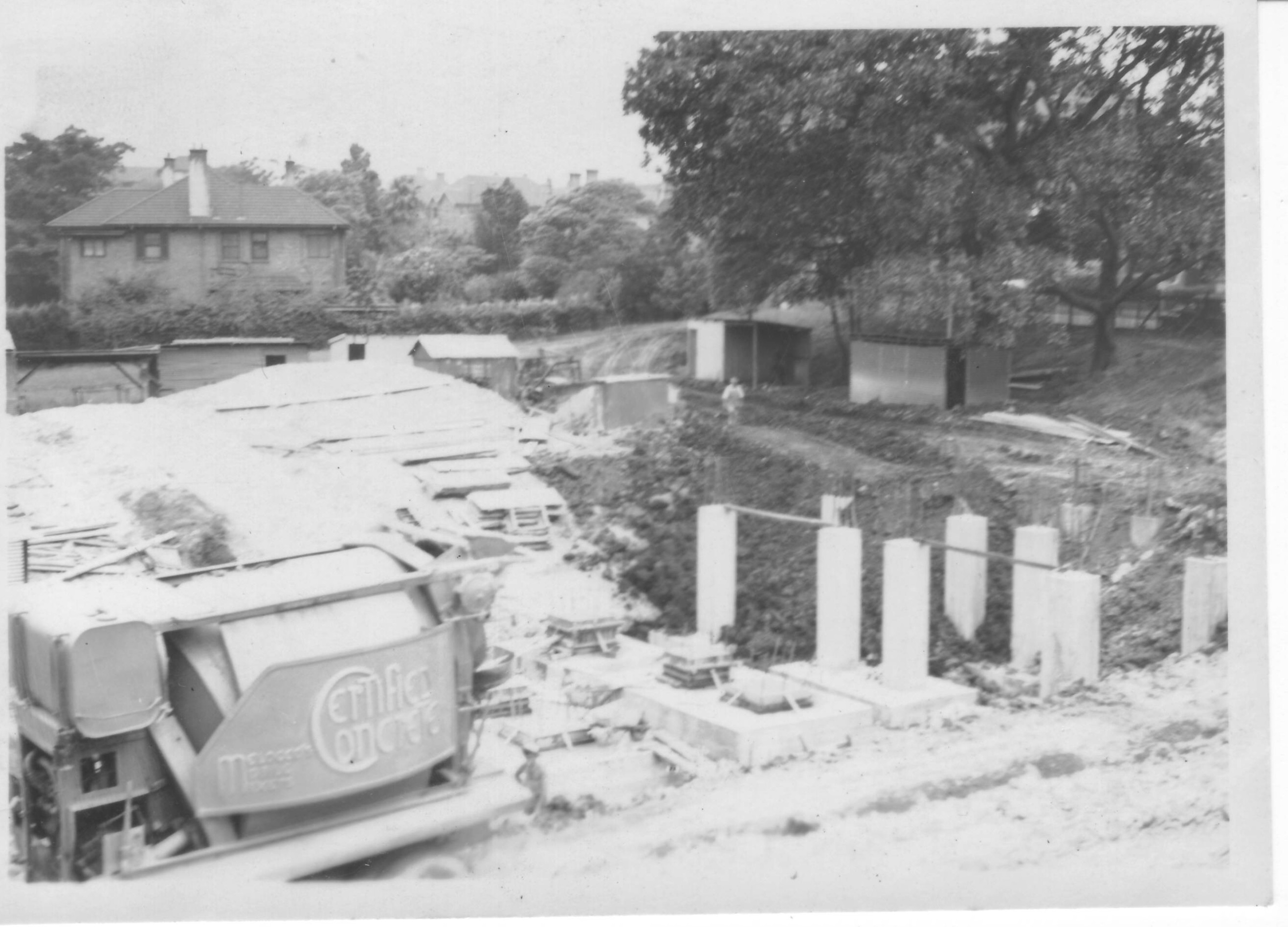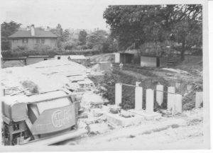 Foundations of Reid building withold Principal’s Lodge behind, Oct 1950 (1953 Reid Building opened)